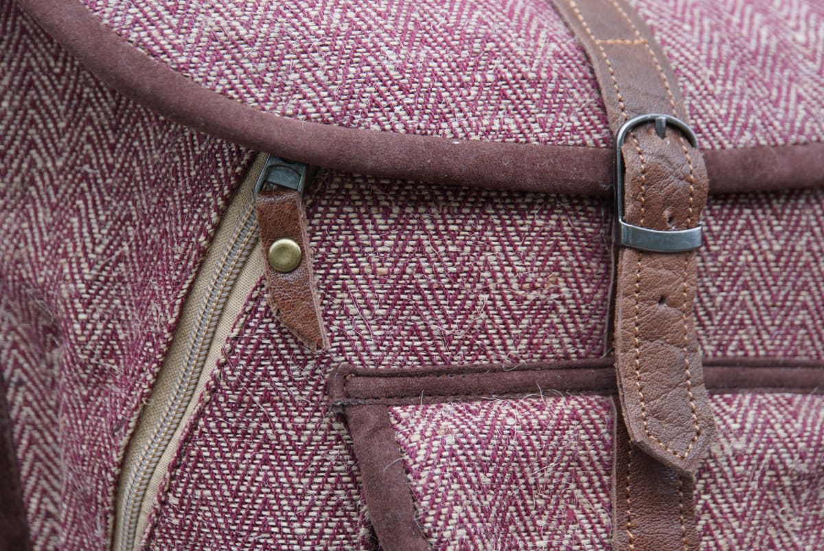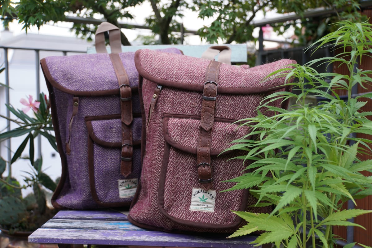 Backpacks and bags made of hemp with leather in various sizes, colours and shapes.